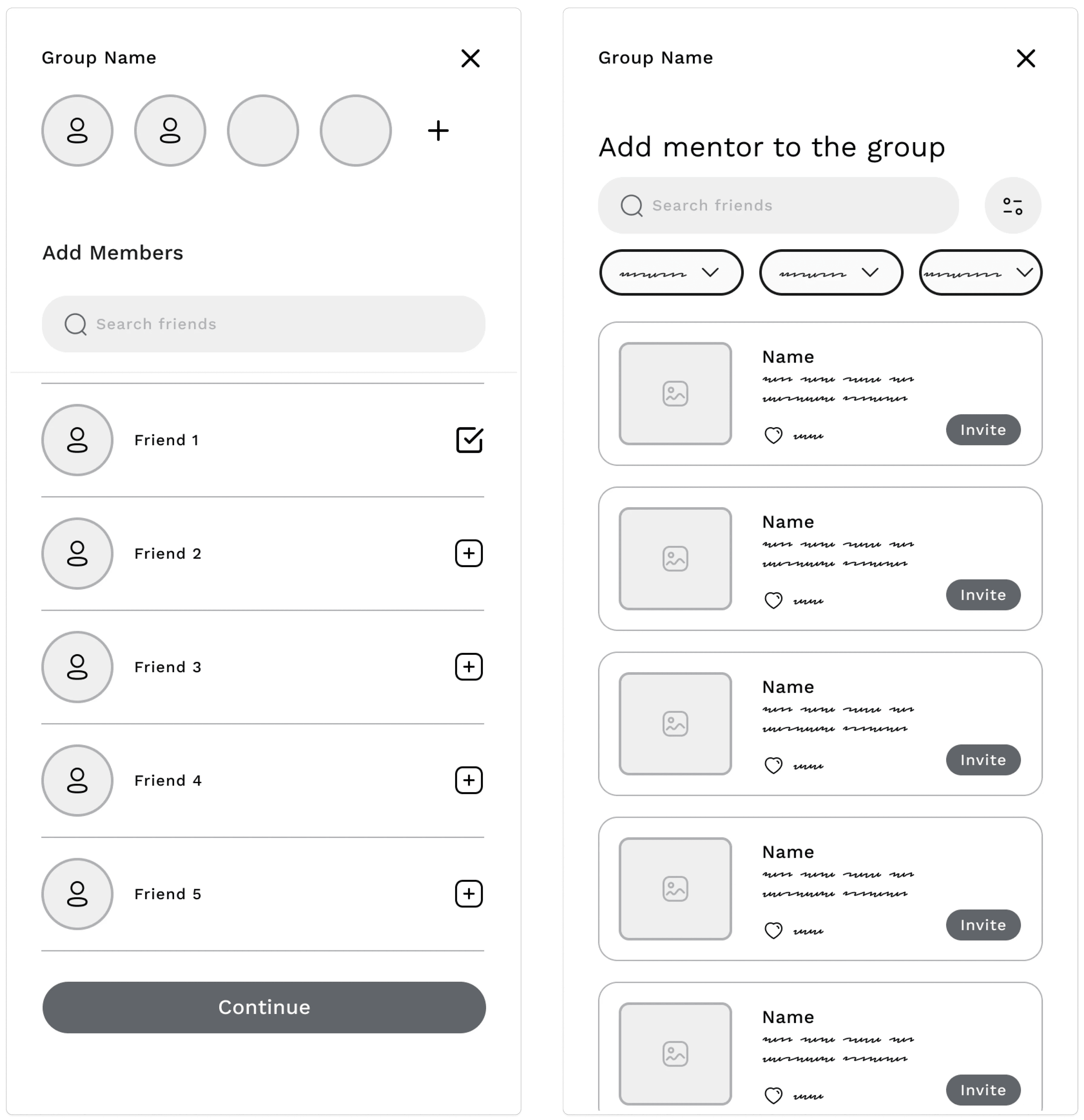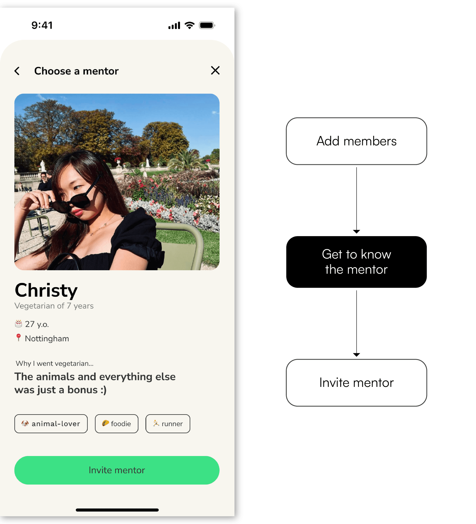 For this concept to work, the user needs to trust the mentor. To facilitate this, I added a page where users can get to know the mentor before selecting one.
