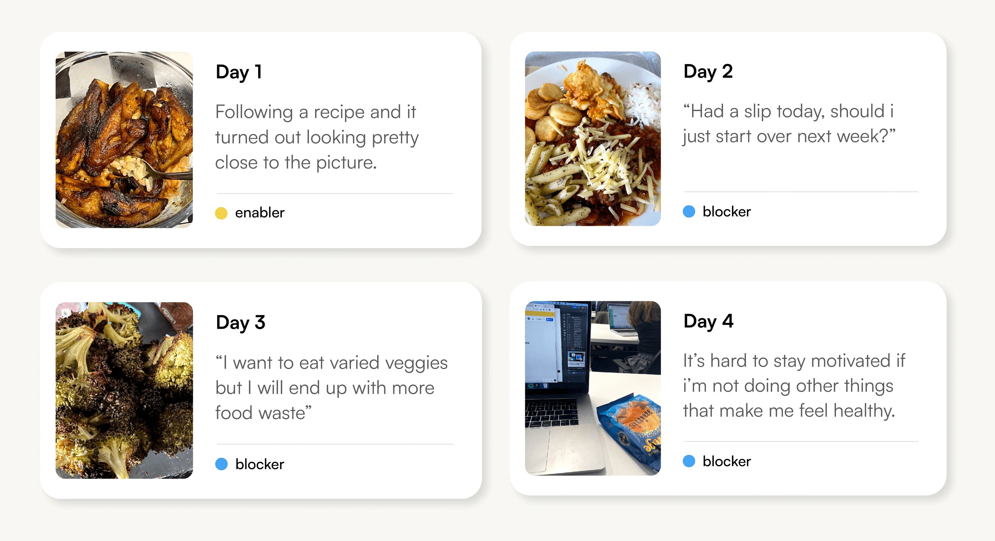Therefore, I started my research by challenging myself to follow a plant-based diet for a week and documenting it. By experiencing the diet transition first-hand, I got to identify the enablers and blockers.