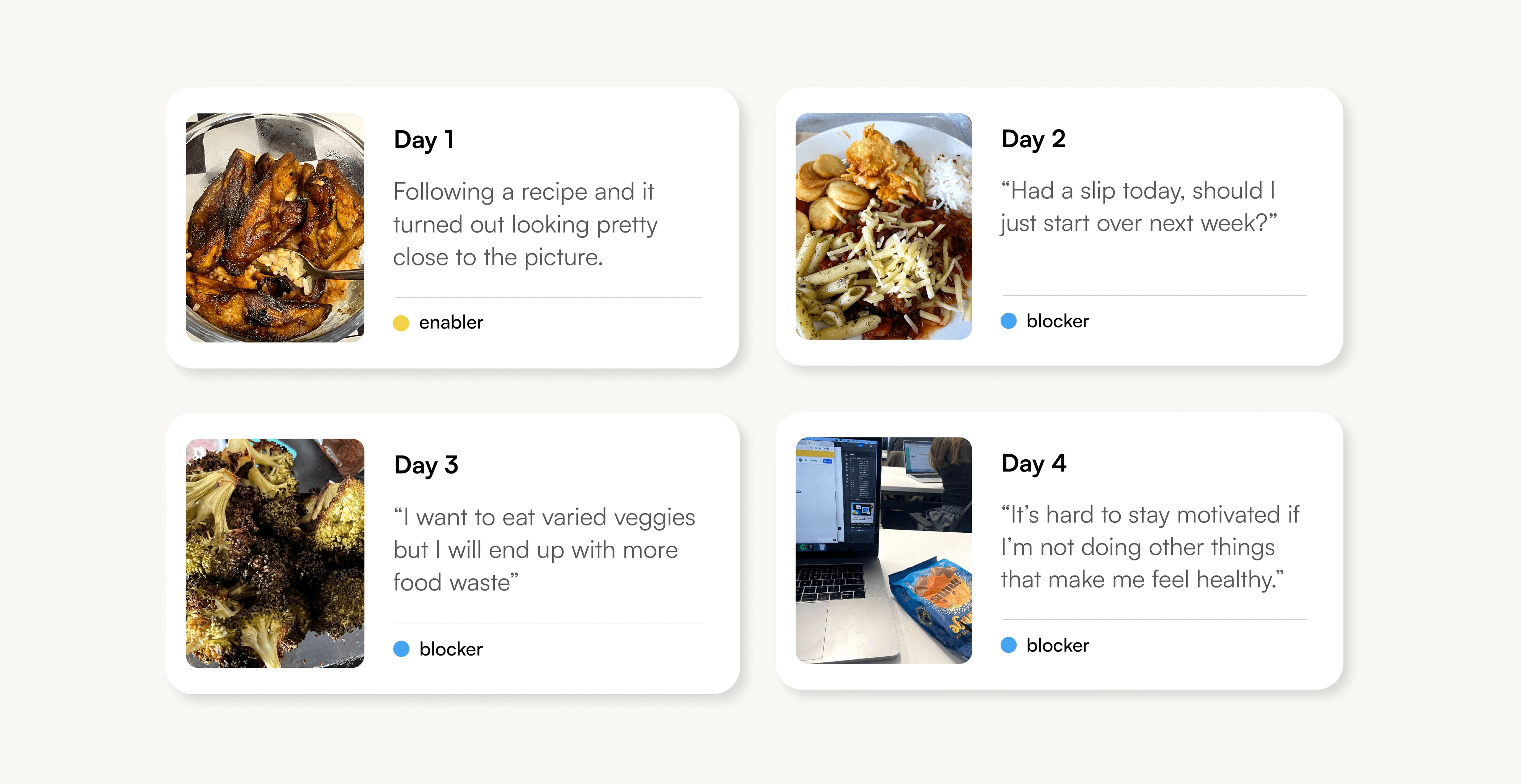 To get more relevant data on how to make the transition frictionless, I asked the participant to eat a plant-based diet for a day and prompted them to report their experience through a messaging app.